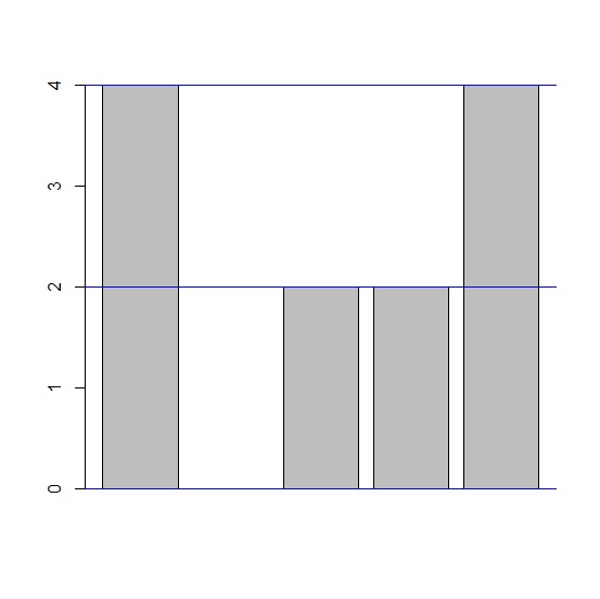 barplot(y) abline(h=c(4,0,2,2,4),col="blue")