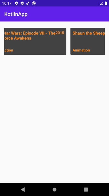 import android.os.Bundle import androidx.appcompat.app.AppCompatActivity import androidx.recyclerview.widget.DefaultItemAnimator import androidx.recyclerview.widget.LinearLayoutManager import androidx.recyclerview.widget.RecyclerView import java.util.ArrayList class MainActivity : AppCompatActivity() { private val movieList = ArrayList<MovieModel>() private lateinit var moviesAdapter: MoviesAdapter override fun onCreate(savedInstanceState: Bundle?) { super.onCreate(savedInstanceState) setContentView(R.layout.activity_main) title = "KotlinApp" val recyclerView = findViewById<RecyclerView>(R.id.recyclerView) moviesAdapter = MoviesAdapter(movieList) val mLayoutManager = LinearLayoutManager(applicationContext) mLayoutManager.orientation = LinearLayoutManager.HORIZONTAL recyclerView.layoutManager = mLayoutManager recyclerView.itemAnimator = DefaultItemAnimator() recyclerView.adapter = moviesAdapter prepareMovieData() } private fun prepareMovieData() { var movie = MovieModel("Mad Max: Fury Road", "Action & Adventure", "2015") movieList.add(movie) movie = MovieModel("Inside Out", "Animation, Kids & Family", "2015") movieList.add(movie) movie = MovieModel("Star Wars: Episode VII - The Force Awakens", "Action", "2015") movieList.add(movie) movie = MovieModel("Shaun the Sheep", "Animation", "2015") movieList.add(movie) movie = MovieModel("The Martian", "Science Fiction & Fantasy", "2015") movieList.add(movie) movie = MovieModel("Mission: Impossible Rogue Nation", "Action", "2015") movieList.add(movie) movie = MovieModel("Up", "Animation", "2009") movieList.add(movie) movie = MovieModel("Star Trek", "Science Fiction", "2009") movieList.add(movie) movie = MovieModel("The LEGO MovieModel", "Animation", "2014") movieList.add(movie) movie = MovieModel("Iron Man", "Action & Adventure", "2008") movieList.add(movie) movie = MovieModel("Aliens", "Science Fiction", "1986") movieList.add(movie) movie = MovieModel("Chicken Run", "Animation", "2000") movieList.add(movie) movie = MovieModel("Back to the Future", "Science Fiction", "1985") movieList.add(movie) movie = MovieModel("Raiders of the Lost Ark", "Action & Adventure", "1981") movieList.add(movie) movie = MovieModel("Goldfinger", "Action & Adventure", "1965") movieList.add(movie) movie = MovieModel("Guardians of the Galaxy", "Science Fiction & Fantasy", "2014") movieList.add(movie) moviesAdapter.notifyDataSetChanged() } }