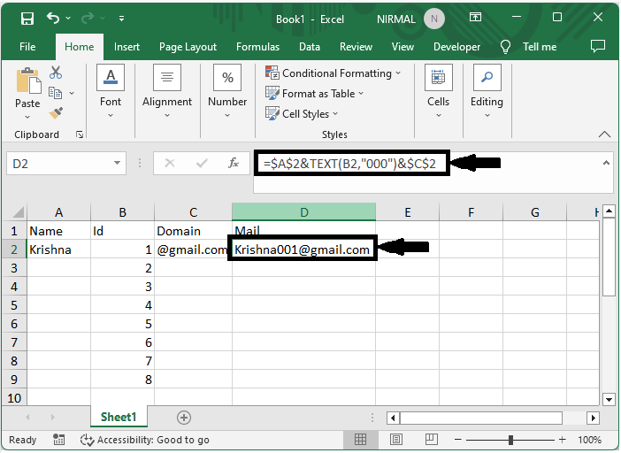 首先,單擊單元格 D2 並輸入公式 =$A$2&TEXT(B2,"000")&$C$2,然後單擊回車以獲取第一個值。在公式中,A2 是文字 1 的地址,B2 是一個數字,C2 是文字 2。