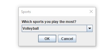package my; import javax.swing.JOptionPane; public class SwingDemo { public static void main(String[] args) { String[] sports = { "Football", "Cricket", "Squash", "Baseball", "Fencing", "Volleyball", "Basketball" }; String res = (String) JOptionPane.showInputDialog(null, "Which sports you play the most?", "Sports", JOptionPane.PLAIN_MESSAGE, null, sports, sports[0]); switch (res) { case "Football" − System.out.println("I Love Football"); break; case "Cricket" − System.out.println("I Love Cricket"); break; case "Squash" − System.out.println("I Love Squash"); break; case "Baseball" − System.out.println("I Love Baseball"); break; case "Fencing" − System.out.println("I Love Fencing"); break; case "Volleyball" − System.out.println("I Love Volleyball"); break; case "Basketball" − System.out.println("I Love Basketball"); break; } } }