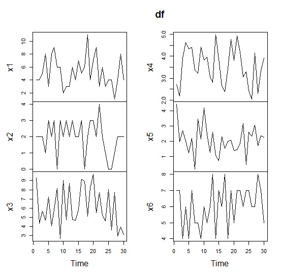 > set.seed(1) > x1<-rpois(30,5) > x2<-rpois(30,2) > x3<-runif(30,2,10) > x4<-runif(30,2,5) > x5<-rnorm(30,2) > x6<-rbinom(30,10,0.6) > df<-data.frame(x1,x2,x3,x4,x5,x6) > head(df,20) x1 x2 x3 x4 x5 x6 1 4 2 9.303007 2.718888 4.4016178 7 2 4 2 4.348827 2.176803 1.9607600 7 3 5 2 5.672526 3.926865 2.6897394 4 4 8 1 4.659157 4.628808 2.0280022 6 5 3 3 7.206964 4.336744 1.2567268 4 6 8 2 4.064134 4.391926 2.1887923 7 7 9 3 5.828362 3.365823 0.1950414 5 8 6 0 8.130485 3.230252 3.4655549 5 9 6 3 2.673975 4.432611 2.1532533 4 10 2 2 9.002571 3.814800 4.1726117 6 11 3 3 4.712584 3.964172 2.4755095 5 12 3 2 8.715523 3.059592 1.2900536 6 13 6 3 4.773468 2.810780 2.6107264 8 14 4 2 4.670199 4.978052 1.0659024 4 15 7 2 5.810810 3.900480 0.7463666 7 16 5 3 9.137587 2.639624 2.2914462 6 17 6 0 8.914716 2.388117 1.5567081 8 18 11 2 5.119916 3.434354 2.0011054 4 19 4 3 8.218566 4.772223 2.0743413 7 20 7 3 9.684944 3.796283 1.4104791 5
