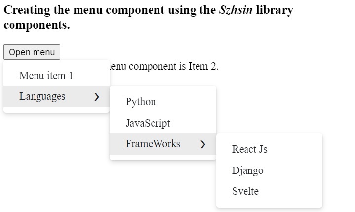 <Menu menuButton={<MenuButton>Open menu</MenuButton>} > <MenuItem value="Item 1" onClick={handleChange}> Menu item 1 </MenuItem> <SubMenu label="Languages"> // menu items </SubMenu> </Menu>