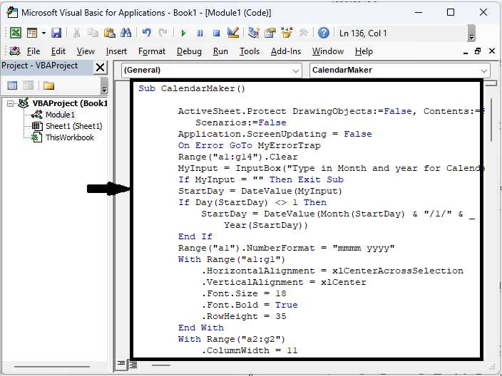 Sub CalendarMaker() ActiveSheet.Protect DrawingObjects:=False, Contents:=False, _ Scenarios:=False Application.ScreenUpdating = False On Error GoTo MyErrorTrap Range("a1:g14").Clear MyInput = InputBox("Type in Month and year for Calendar ") If MyInput = "" Then Exit Sub StartDay = DateValue(MyInput) If Day(StartDay) <> 1 Then StartDay = DateValue(Month(StartDay) & "/1/" & _ Year(StartDay)) End If Range("a1").NumberFormat = "mmmm yyyy" With Range("a1:g1") .HorizontalAlignment = xlCenterAcrossSelection .VerticalAlignment = xlCenter .Font.Size = 18 .Font.Bold = True .RowHeight = 35 End With With Range("a2:g2") .ColumnWidth = 11 .VerticalAlignment = xlCenter .HorizontalAlignment = xlCenter .VerticalAlignment = xlCenter .Orientation = xlHorizontal .Font.Size = 12 .Font.Bold = True .RowHeight = 20 End With Range("a2") = "Sunday" Range("b2") = "Monday" Range("c2") = "Tuesday" Range("d2") = "Wednesday" Range("e2") = "Thursday" Range("f2") = "Friday" Range("g2") = "Saturday" With Range("a3:g8") .HorizontalAlignment = xlRight .VerticalAlignment = xlTop .Font.Size = 18 .Font.Bold = True .RowHeight = 21 End With Range("a1").Value = Application.Text(MyInput, "mmmm yyyy") DayofWeek = WeekDay(StartDay) CurYear = Year(StartDay) CurMonth = Month(StartDay) FinalDay = DateSerial(CurYear, CurMonth + 1, 1) Select Case DayofWeek Case 1 Range("a3").Value = 1 Case 2 Range("b3").Value = 1 Case 3 Range("c3").Value = 1 Case 4 Range("d3").Value = 1 Case 5 Range("e3").Value = 1 Case 6 Range("f3").Value = 1 Case 7 Range("g3").Value = 1 End Select For Each cell In Range("a3:g8") RowCell = cell.Row ColCell = cell.Column If cell.Column = 1 And cell.Row = 3 Then ElseIf cell.Column <> 1 Then If cell.Offset(0, -1).Value >= 1 Then cell.Value = cell.Offset(0, -1).Value + 1 If cell.Value > (FinalDay - StartDay) Then cell.Value = "" Exit For End If End If ElseIf cell.Row > 3 And cell.Column = 1 Then cell.Value = cell.Offset(-1, 6).Value + 1 ' Stop when the last day of the month has been entered. If cell.Value > (FinalDay - StartDay) Then cell.Value = "" Exit For End If End If Next For x = 0 To 5 Range("A4").Offset(x * 2, 0).EntireRow.Insert With Range("A4:G4").Offset(x * 2, 0) .RowHeight = 65 .HorizontalAlignment = xlCenter .VerticalAlignment = xlTop .WrapText = True .Font.Size = 10 .Font.Bold = False .Locked = False End With ' Put border around the block of dates. With Range("A3").Offset(x * 2, 0).Resize(2, _ 7).Borders(xlLeft) .Weight = xlThick .ColorIndex = xlAutomatic End With With Range("A3").Offset(x * 2, 0).Resize(2, _ 7).Borders(xlRight) .Weight = xlThick .ColorIndex = xlAutomatic End With Range("A3").Offset(x * 2, 0).Resize(2, 7).BorderAround _ Weight:=xlThick, ColorIndex:=xlAutomatic Next If Range("A13").Value = "" Then Range("A13").Offset(0, 0) _ .Resize(2, 8).EntireRow.Delete ActiveWindow.DisplayGridlines = False ActiveSheet.Protect DrawingObjects:=True, Contents:=True, _ Scenarios:=True ActiveWindow.WindowState = xlMaximized ActiveWindow.ScrollRow = 1 Application.ScreenUpdating = True Exit Sub MyErrorTrap: MsgBox "You may not have entered your Month and Year correctly." _ & Chr(13) & "Spell the Month correctly" _ & " (or use 3 letter abbreviation)" _ & Chr(13) & "and 4 digits for the Year" MyInput = InputBox("Type in Month and year for Calendar") If MyInput = "" Then Exit Sub Resume End Sub