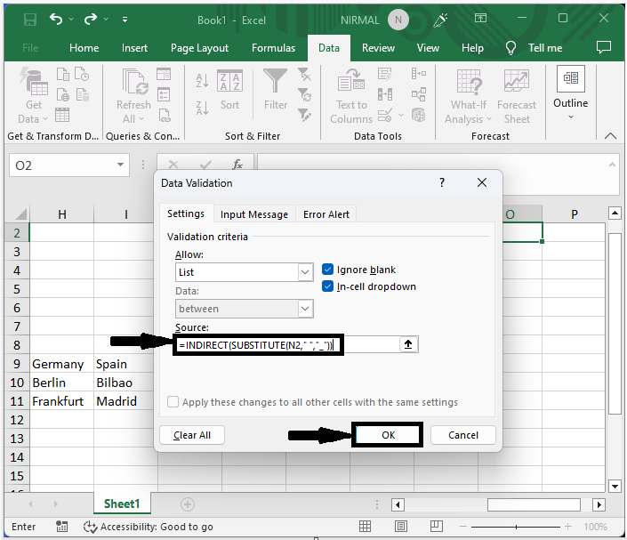 再次單擊“資料”並選擇“資料驗證”。然後將“允許”設定為“列表”,並將“來源”輸入為=INDIRECT(SUBSTITUTE(m2," ","_")),然後單擊“確定”。