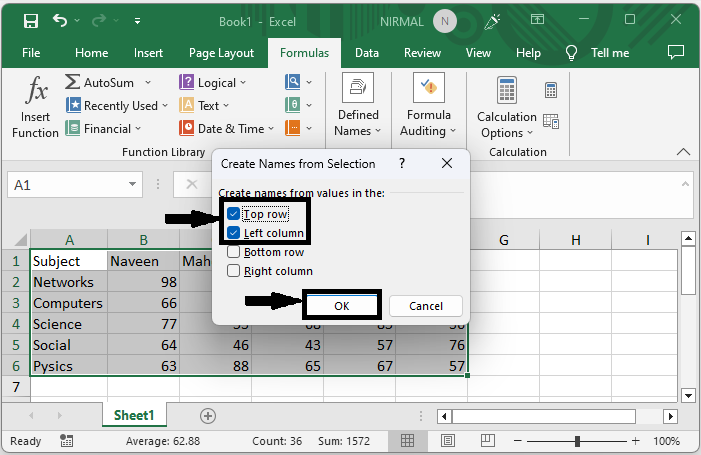 選擇單元格 > 公式 > 根據選區建立。