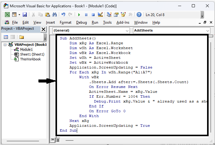 在本文中,我們將首先建立 VBA 模組,然後選擇要執行任務的單元格範圍。因此,讓我們瞭解一個簡單過程,來了解如何在 Excel 中從單元格值列表建立多個工作表。