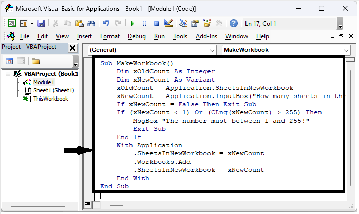 首先,我們將建立一個 VBA 模組,然後執行它並指定所需的工作表數量來完成任務。讓我們來看一個簡單的過程,學習如何在 Excel 中建立具有特定工作表數量的新工作簿。