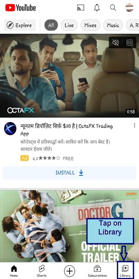 開啟 YouTube 應用。首先,開啟手機上的 YouTube 應用。點選“資料庫”選項將其開啟。