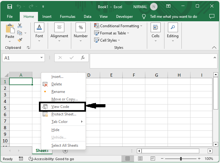 考慮任何 Excel 工作表。首先,右鍵單擊工作表名稱,然後為 VBA 應用程式選擇“檢視程式碼”。