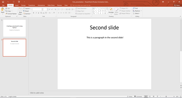 paragraph = textframe.add_paragraph() paragraph.text = "This is a paragraph in the second slide!"
