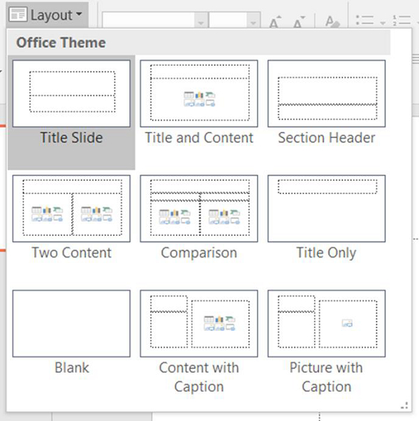 如您所見,共有九種不同的佈局。在pptx模組中,每個佈局的編號從0到8。“標題幻燈片”為0,“帶標題的圖片”為8。