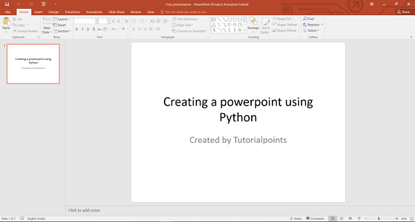 first_slide.shapes.title.text = "Creating a powerpoint using Python" first_slide.placeholders[1].text = "Created by Tutorialpoints"
