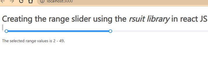 import React from "react"; import RangeSlider from "rsuite/RangeSlider"; import "rsuite/dist/rsuite.css"; import { useState } from "react"; function App() { const [firstValue, setFirstValue] = useState(2); const [secondValue, setSecondValue] = useState(10); function handleRanges(value) { setFirstValue(value[0]); setSecondValue(value[1]); } return ( <div style = {{ width: "50rem", padding: "20px" }}> <h3>Creating the range slider using the <i> rsuit library</i> in react JS </h3> <br /> <RangeSlider defaultValue={[2, 10]} onChange={handleRanges} /> <br /> The selected range value is {firstValue} - {secondValue}. </div> ); } export default App;