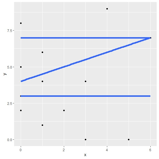 x<-rpois(25,2) y<-rpois(25,5) df<-data.frame(x,y) library(ggplot2) ggplot(df,aes(x,y))+geom_point()+stat_quantile(formula=y~x,quantiles=c(0.25,0.50,0.75 ),size=2)