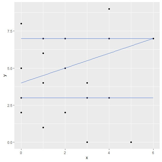 x<-rpois(25,2) y<-rpois(25,5) df<-data.frame(x,y) library(ggplot2) ggplot(df,aes(x,y))+geom_point()+stat_quantile(formula=y~x,quantiles=c(0.25,0.50,0.75 ))