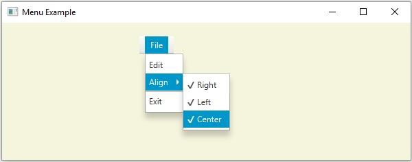RadioMenuItem sub3 = new RadioMenuItem("Center");