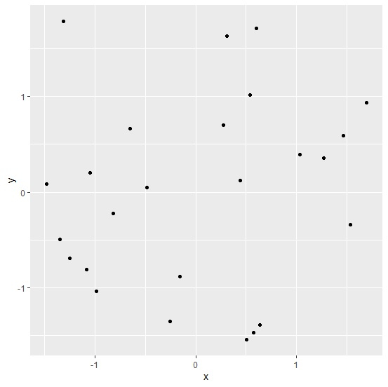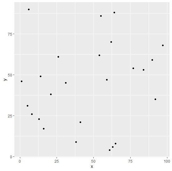 x<-sample(1:100,25) y<-sample(1:100,25) df<-data.frame(x,y) library(ggplot2) ggplot(df,aes(x,y))+geom_point()