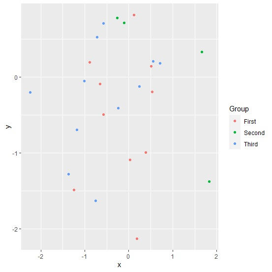 x y Group 1 0.03036902 -1.08989993 First 2 -1.36496321 -1.28054928 Third 3 0.23855417 -0.12276306 Third 4 0.52709378 -0.19730924 First 5 -1.24295750 -1.48467998 First 6 -0.57012334 0.70429757 Third 7 -2.23872847 -0.20110399 Third 8 0.51140516 0.14296460 First 9 0.55635303 0.20972904 Third 10 -0.24455115 -0.41292120 Third 11 0.38049399 -0.99364419 First 12 0.71502187 0.18136820 Third 13 -0.65251508 -0.09298097 First 14 -0.88401096 0.19342739 First 15 1.66023122 0.32843555 Second 16 -0.58101208 -0.49223091 First 17 -1.17912751 -0.69346144 Third 18 -0.75448095 -1.63278740 Third 19 -1.01581774 -0.05109014 Third 20 0.18852503 -2.13195617 First 21 -0.10338979 0.71512367 Second 22 1.83279352 -1.37538539 Second 23 -0.71975579 0.52236441 Third 24 0.12262292 0.81983890 First 25 -0.26669515 0.77764427 Second