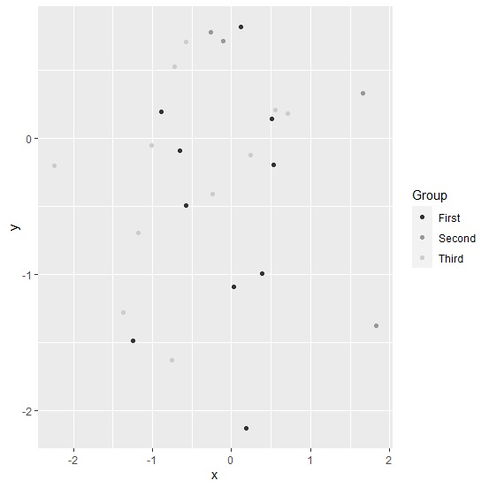 ggplot(df,aes(x,y,color=Group))+geom_point()+scale_color_grey()輸出