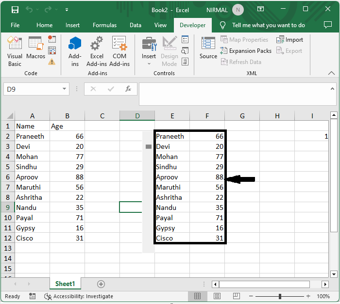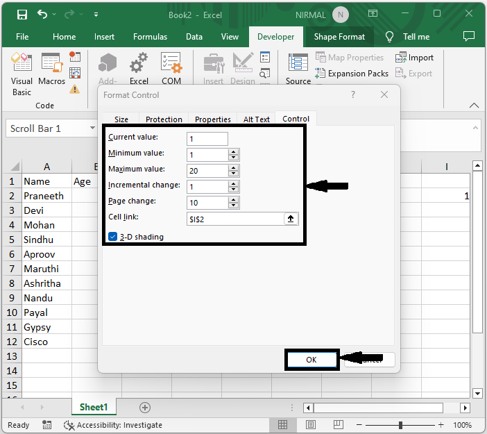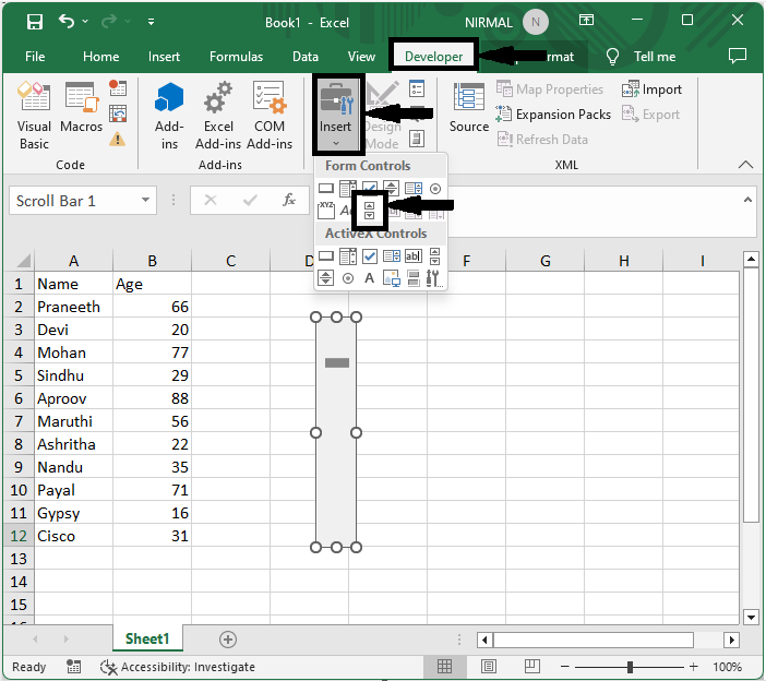 考慮任何 Excel 表格。首先,單擊“開發工具”,然後單擊“插入”,然後選擇“窗體控制元件”中的“捲軸”,並將其繪製到適當的大小。