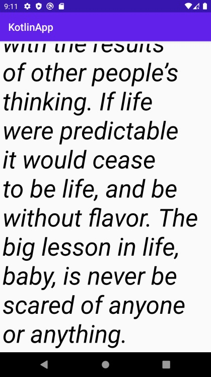val text: String = "Your time is limited, so don’t waste it living someone else’s life. Don’t be trapped by dogma – which is living with the results of other people’s thinking. " + "If life were predictable it would cease to be life, and be without flavor. The big lesson in life, baby, is never be scared of anyone or anything."