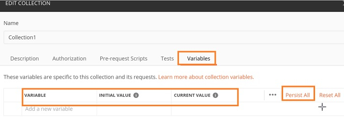 CURRENT VALUE(當前值)對使用者具有區域性性,並且永遠不會與 Postman 伺服器同步。我們還可以用當前值替換或修改 INITIAL VALUE(初始值)。