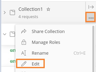 我們可以給集合變數和全域性及環境變數分配當前值。要給集合分配當前值,請單擊集合名稱旁邊的三個點,然後單擊編輯。