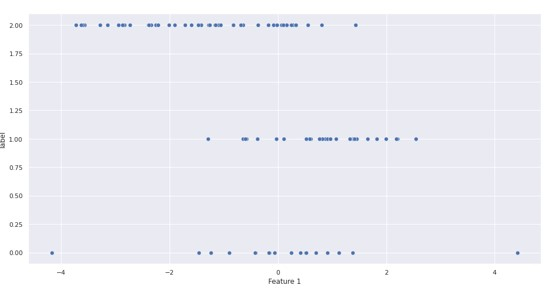 from sklearn.datasets import make_classification import pandas as pd import seaborn as sns # Creating a simulated feature matrix and output vector with 100 samples features, output = make_classification(n_samples = 100, # taking ten features n_features = 10, # five features that predict the output's classes n_informative = 5, # five features that are random and unrelated to the output's classes n_redundant = 5, # three output classes n_classes = 3, # with 20% of observations in the first class, 30% in the second class, # and 50% in the third class. ('None' makes balanced classes) weights = [.2, .3, .8]) print("Feature Dataframe: "); df_features = pd.DataFrame(features, columns=["Feature 1", "Feature 2","Feature 3", "Feature 4", "Feature 5","Feature 6", "Feature 7", "Feature 8", "Feature 9", "Feature 10"]) output_series = pd.Series(output,name='label') df = pd.concat([df_features,output_series],axis=1) print(df.head()) ## plot using seaborn sns.set(rc={"figure.figsize":(16, 8)}) ## Plotting 'Feature 1' vs label sns.scatterplot(data=df,x='Feature 1',y='label',s=50)