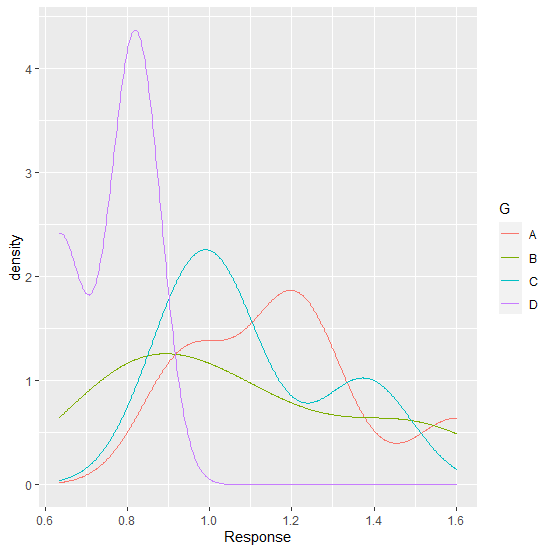 > library(ggplot2) > ggplot(df,aes(Response))+stat_density(aes(group=G,color=G),position="identity",geom="line")