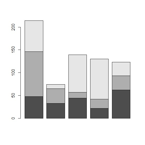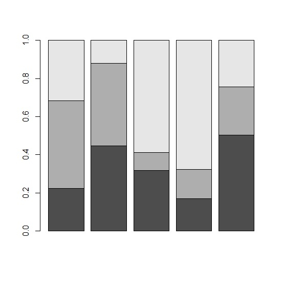> data<-rbind(x1,x2,x3) > prop.table(data) [,1] [,2] [,3] [,4] [,5] x1 0.07058824 0.04852941 0.06470588 0.03235294 0.09117647 x2 0.14411765 0.04705882 0.01911765 0.02941176 0.04558824 x3 0.10000000 0.01323529 0.12058824 0.12941176 0.04411765 > barplot(data)