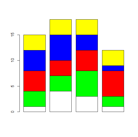 barplot(M1,col=rep(c("white","green","red","blue","yellow"),5))輸出