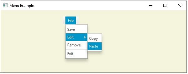 選單是呈現給使用者的選項或命令的列表,通常,選單包含執行某些操作的專案。選單的內容稱為選單專案,一個選單欄包含多個選單。可以建立選單,透過例項化 javafx.scene.control.Menu 類。