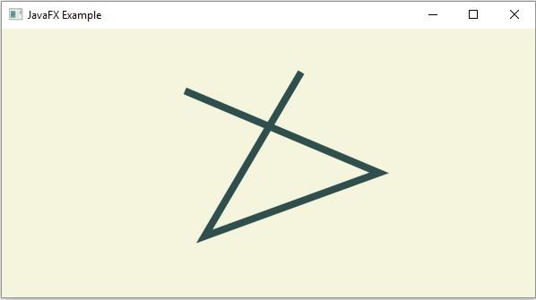 import javafx.application.Application; import javafx.scene.Group; import javafx.scene.Scene; import javafx.scene.paint.Color; import javafx.stage.Stage; import javafx.scene.shape.LineTo; import javafx.scene.shape.MoveTo; import javafx.scene.shape.Path; public class LineToExample extends Application { public void start(Stage stage) { //Creating PathElement objects MoveTo moveTo = new MoveTo(208, 71); LineTo line1 = new LineTo(421, 161); LineTo line2 = new LineTo(226,232); LineTo line3 = new LineTo(332,52); //Creating a Path Path path = new Path(); path.getElements().addAll(moveTo, line1, line2, line3); //Setting other properties path.setStrokeWidth(8.0); path.setStroke(Color.DARKSLATEGREY); //Preparing the Stage object Group root = new Group(path); Scene scene = new Scene(root, 595, 300, Color.BEIGE); stage.setTitle("JavaFX Example"); stage.setScene(scene); stage.show(); } public static void main(String args[]){ launch(args); } }