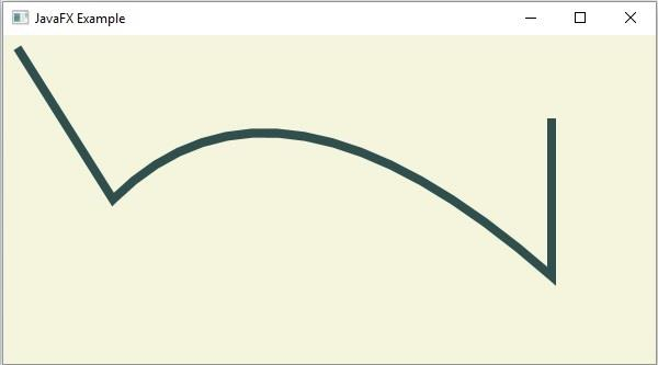 import javafx.application.Application; import javafx.scene.Group; import javafx.scene.Scene; import javafx.scene.paint.Color; import javafx.stage.Stage; import javafx.scene.shape.LineTo; import javafx.scene.shape.MoveTo; import javafx.scene.shape.Path; import javafx.scene.shape.QuadCurveTo; import javafx.scene.shape.VLineTo; public class QuadraticCurveToExample extends Application { public void start(Stage stage) { //Creating PathElement objects MoveTo moveTo = new MoveTo(15, 15); LineTo line1 = new LineTo(100, 150); //Instantiating the class QuadCurve QuadCurveTo quadCurveTo = new QuadCurveTo(); //Setting properties of the class QuadCurve quadCurveTo.setX(500.0f); quadCurveTo.setY(220.0f); quadCurveTo.setControlX(250.0f); quadCurveTo.setControlY(0.0f); //Creating the HLineTo object VLineTo vLine = new VLineTo(); vLine.setY(80); //Creating a Path Path path = new Path(); path.getElements().addAll(moveTo, line1, quadCurveTo, vLine); //Setting other properties path.setStrokeWidth(8.0); path.setStroke(Color.DARKSLATEGREY); //Preparing the Stage object Group root = new Group(path); Scene scene = new Scene(root, 595, 300, Color.BEIGE); stage.setTitle("JavaFX Example"); stage.setScene(scene); stage.show(); } public static void main(String args[]){ launch(args); } }