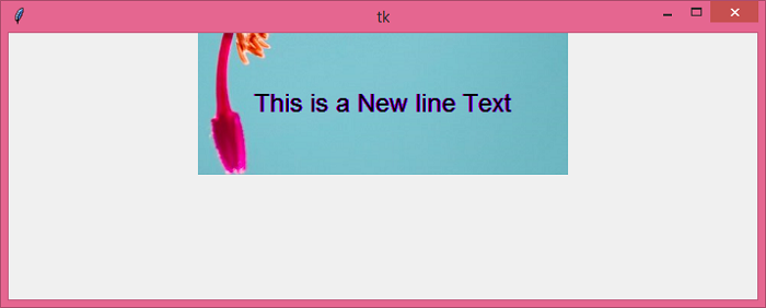 #Import the required libraries from tkinter import * #Create an instance of Tkinter Frame win = Tk() #Set the geometry win.geometry("700x250") #Adding transparent background property win.wm_attributes('-transparentcolor', '#ab23ff') #Create a Label Label(win, text= "This is a New line Text", font= ('Helvetica 18'), bg= '#ab23ff').pack(ipadx= 50, ipady=50, padx= 20) win.mainloop()