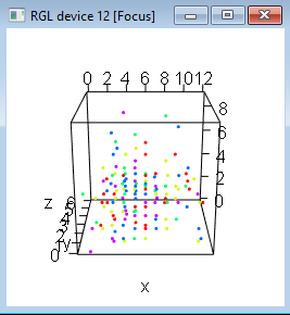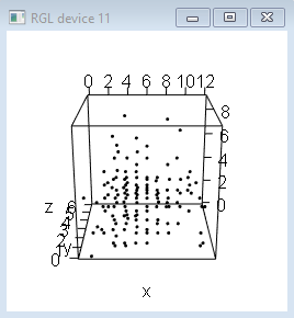 > library(rgl) > x<-rpois(200,5) > y<-rpois(200,2) > z<-rpois(200,3) > plot3d(x,y,z)