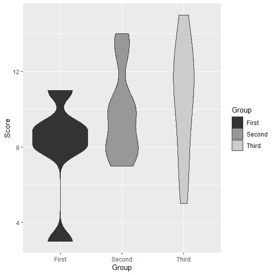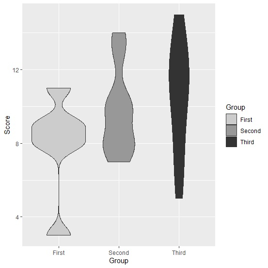 ggplot(df,aes(Group,Score,fill=Group))+geom_violin()+scale_fill_grey()輸出