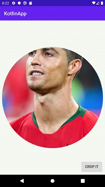 <?xml version="1.0" encoding="utf-8"?> <RelativeLayout xmlns:android="http://schemas.android.com/apk/res/android" xmlns:tools="http://schemas.android.com/tools" android:layout_width="match_parent" android:layout_height="match_parent" android:background="#edf2ea" android:padding="8dp" tools:context=".MainActivity"> <ImageView android:id="@+id/iv" android:layout_width="match_parent" android:layout_height="500dp" android:layout_centerInParent="true" /> <Button android:id="@+id/btn" android:layout_width="wrap_content" android:layout_height="wrap_content" android:layout_alignParentEnd="true" android:layout_alignParentBottom="true" android:text="Crop It" /> </RelativeLayout>