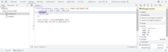 當代碼執行到達 debugger 語句時,瀏覽器的除錯工具將開啟。開發人員可以檢查變數值、逐步執行程式碼並觀察程式的狀態。在這種情況下,偵錯程式將顯示 num1、num2 和 sum 的當前值。