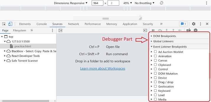 開啟原始碼選項卡後,向下滾動偵錯程式的右側部分,直到您看到DOM 斷點或事件偵聽器斷點。