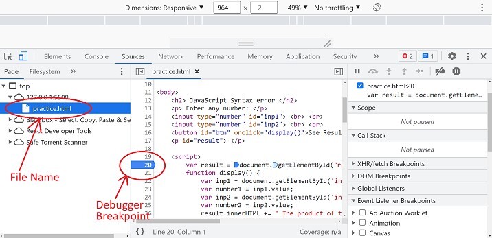 透過設定斷點來除錯 JavaScript 程式碼的方式是與其他兩種方法相比,一種更好、更高效且更快的除錯方法。透過這種除錯方式,我們可以在我們編寫的程式碼的不同點設定不同的斷點,這將在遇到斷點時停止程式的執行,並允許我們檢查程式碼並對其進行更改,以便最大程度地減少程式碼中的錯誤。