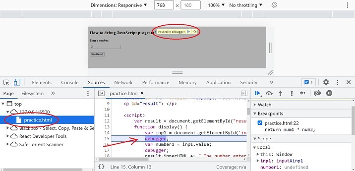 以下示例將說明使用 debugger 關鍵字除錯 JavaScript 程式: