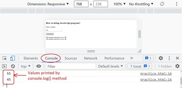 在上述程式碼的輸出影像中,如果 console.log() 方法在控制檯視窗中列印的值每次都與您輸入的值相同,則程式碼按預期工作,並且程式碼中不會出現任何錯誤。但是,如果值不同或控制檯中未列印任何內容,則需要分析程式碼並進行必要的更改或需要除錯。