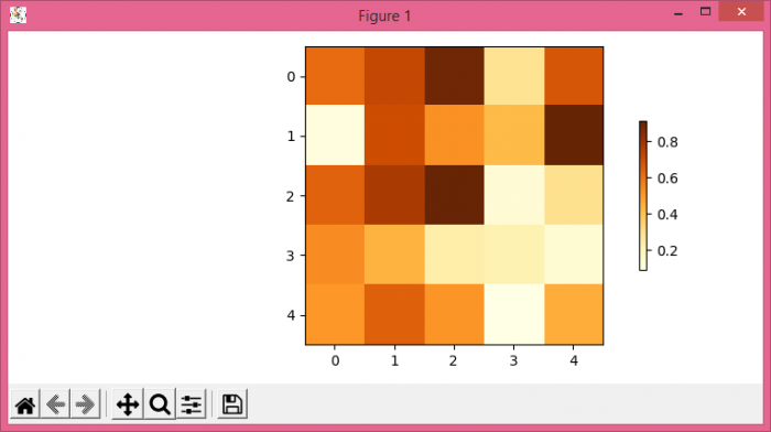import numpy as np from matplotlib import pyplot as plt plt.rcParams["figure.figsize"] = [7.50, 3.50] plt.rcParams["figure.autolayout"] = True data = np.random.rand(5, 5) im = plt.imshow(data, cmap="YlOrBr") plt.colorbar(im, shrink=0.50) plt.show()