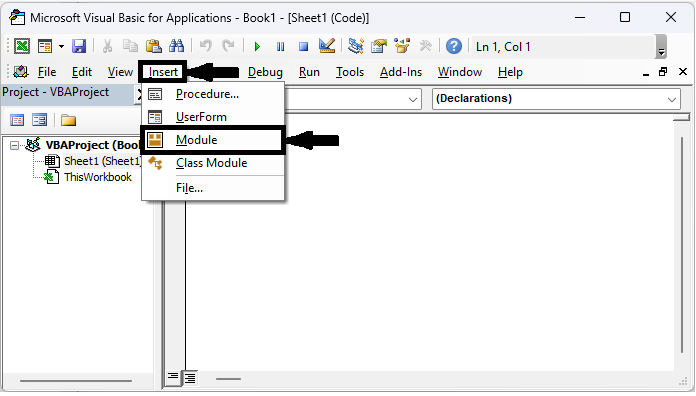 考慮任何 Excel 表格。首先,右鍵單擊工作表名稱,然後選擇“檢視程式碼”以開啟 VBA 應用程式。然後在 VBA 應用程式中,單擊“插入”,然後選擇“模組”。