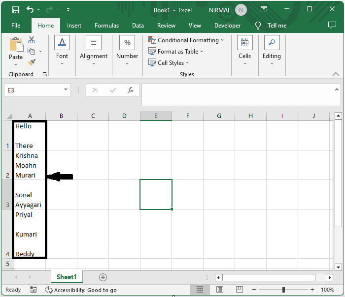 考慮一個 Excel 表格,其中包含多行文字的單元格列表,類似於下圖所示。