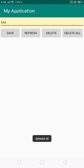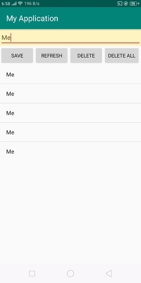 <?xml version = "1.0" encoding = "utf-8"?> <LinearLayout xmlns:android = "http://schemas.android.com/apk/res/android" xmlns:tools = "http://schemas.android.com/tools" android:layout_width = "match_parent" android:layout_height = "match_parent" tools:context = ".MainActivity" android:orientation = "vertical"> <EditText android:id = "@+id/name" android:layout_width = "match_parent" android:hint = "Enter Name" android:layout_height = "wrap_content" /> <LinearLayout android:layout_width = "wrap_content" android:layout_height = "wrap_content"> <Button android:id = "@+id/save" android:text = "Save" android:layout_width = "wrap_content" android:layout_height = "wrap_content" /> <Button android:id = "@+id/refresh" android:text = "Refresh" android:layout_width = "wrap_content" android:layout_height = "wrap_content" /> <Button android:id = "@+id/delete" android:text = "Delete" android:layout_width = "wrap_content" android:layout_height = "wrap_content" /> <Button android:id = "@+id/deleteall" android:text = "Delete ALL" android:layout_width = "wrap_content" android:layout_height = "wrap_content" /> </LinearLayout> <ListView android:id = "@+id/listView" android:layout_width = "match_parent" android:layout_height = "wrap_content"> </ListView> </LinearLayout>