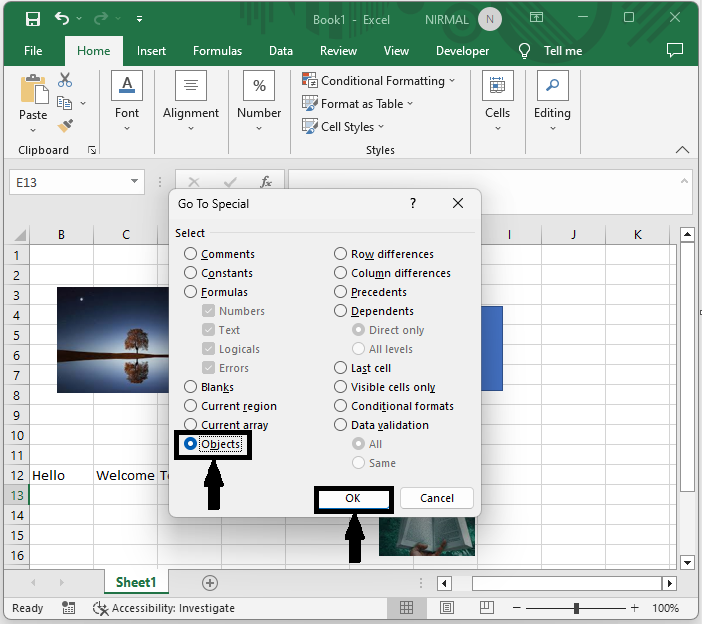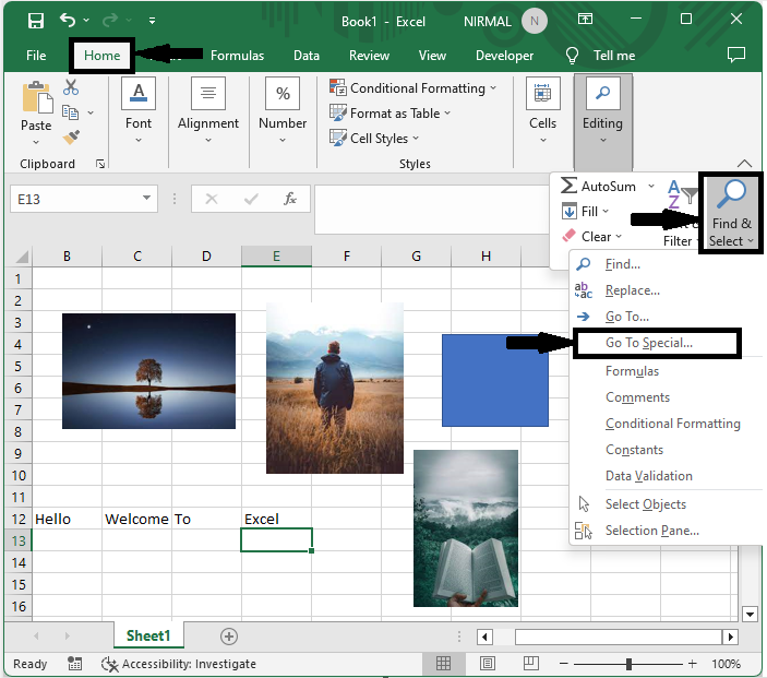 首先,我們將使用“定位”功能選擇單元格範圍,然後將其刪除以完成任務。讓我們來看一個簡單的步驟,瞭解如何輕鬆刪除Excel中的所有圖片或其他物件。