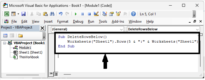 首先,我們將建立一個VBA模組並執行它來完成任務。讓我們來看一個簡單的過程,瞭解如何在Excel中刪除特定行或活動單元格下方的所有行。