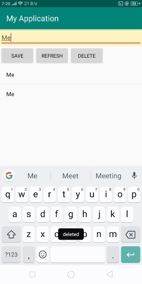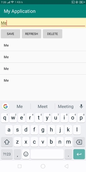 <?xml version = "1.0" encoding = "utf-8"?> <LinearLayoutxmlns:android = "http://schemas.android.com/apk/res/android" xmlns:tools = "http://schemas.android.com/tools" android:layout_width = "match_parent" android:layout_height = "match_parent" tools:context = ".MainActivity" android:orientation = "vertical"> <EditText android:id = "@+id/name" android:layout_width = "match_parent" android:hint = "Enter Name" android:layout_height = "wrap_content" /> <LinearLayout android:layout_width = "wrap_content" android:layout_height = "wrap_content"> <Button android:id = "@+id/save" android:text = "Save" android:layout_width = "wrap_content" android:layout_height = "wrap_content" /> <Button android:id = "@+id/refresh" android:text = "Refresh" android:layout_width = "wrap_content" android:layout_height = "wrap_content" /> <Button android:id = "@+id/delete" android:text = "Delete" android:layout_width = "wrap_content" android:layout_height = "wrap_content" /> </LinearLayout> <ListView android:id = "@+id/listView" android:layout_width = "match_parent" android:layout_height = "wrap_content"> </ListView> </LinearLayout>